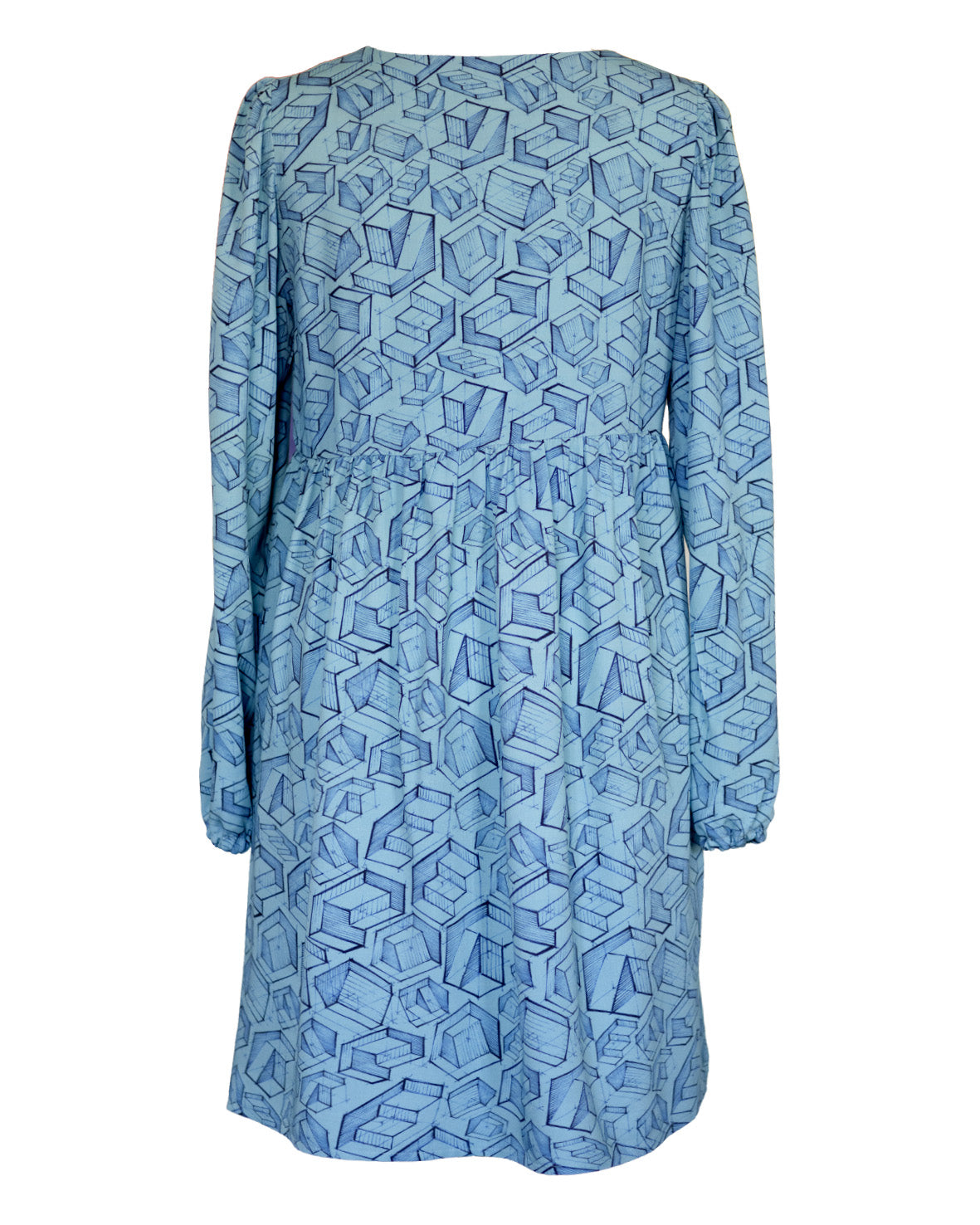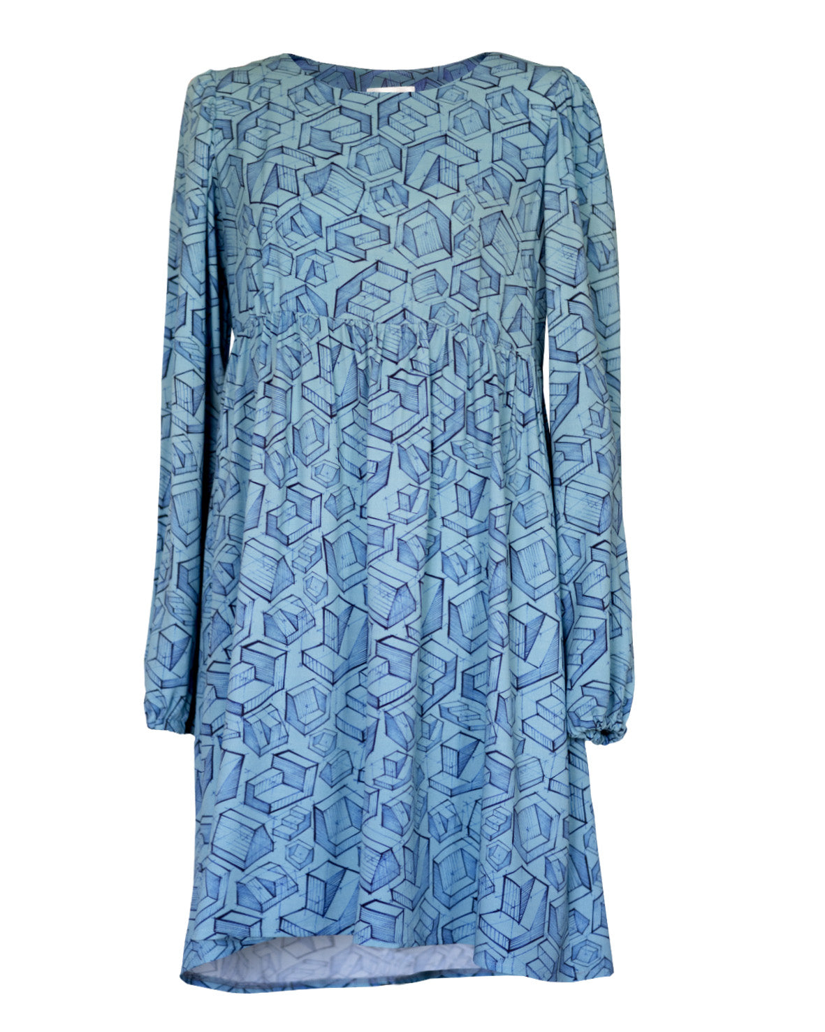 Abito con gonna a pieghe lunga sopra al ginocchio. Modello con taglio "impero" e maniche lunghe con elastico al fondo. Scollo rotondo . Prodotto in fresca viscosa certificata ECOVERO.