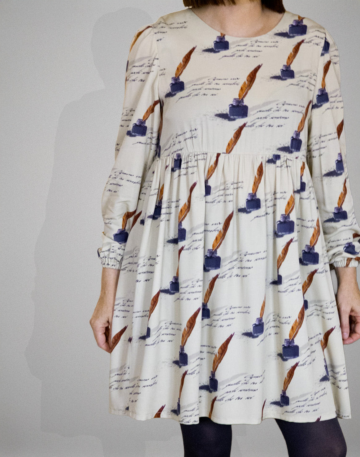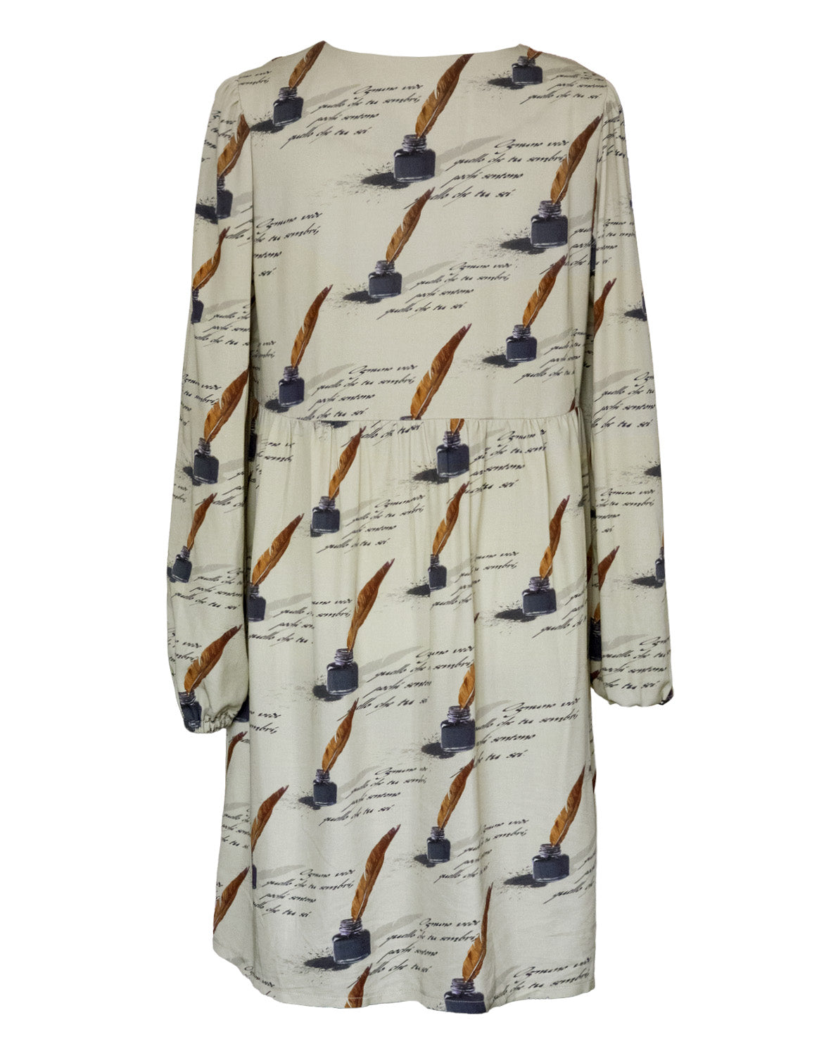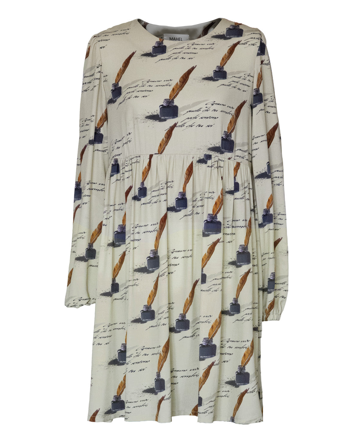 Abito con gonna a pieghe lunga sopra al ginocchio. Modello con taglio "impero" e maniche lunghe con elastico al fondo. Scollo rotondo . Prodotto in fresca viscosa certificata ECOVERO.
